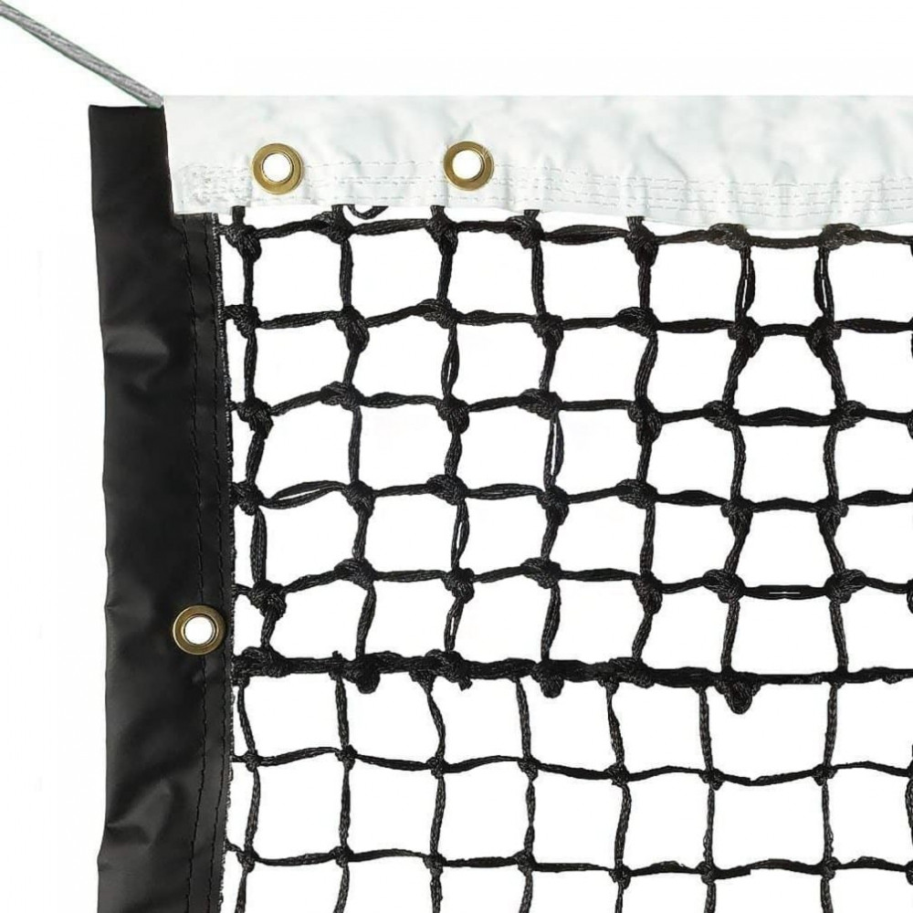 Сетка для большого тенниса двойного плетения 4 мм, с размерами 1,07х12,80 м, сделанная из полипропилена и капрона, в комплекте со стальным тросом.